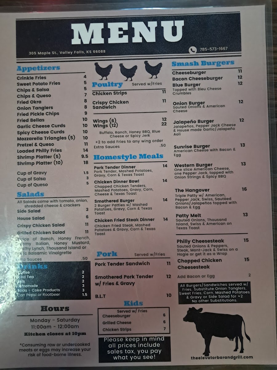 Welcome to The Elevator, a true hidden gem in Valley Falls, Kansas. Nestled at 305 Maple St, this delightful eatery offers an exciting menu that caters to a variety of tastes and appetites. From their scrumptious B.L.T at just $9.00 to the hearty Smothered Pork Tender with fries and gravy for $11.00, every dish is crafted with care. For the little ones, options like the Cheeseburger, Grilled Cheese, and Chicken Strips are all at an affordable $6.00.
